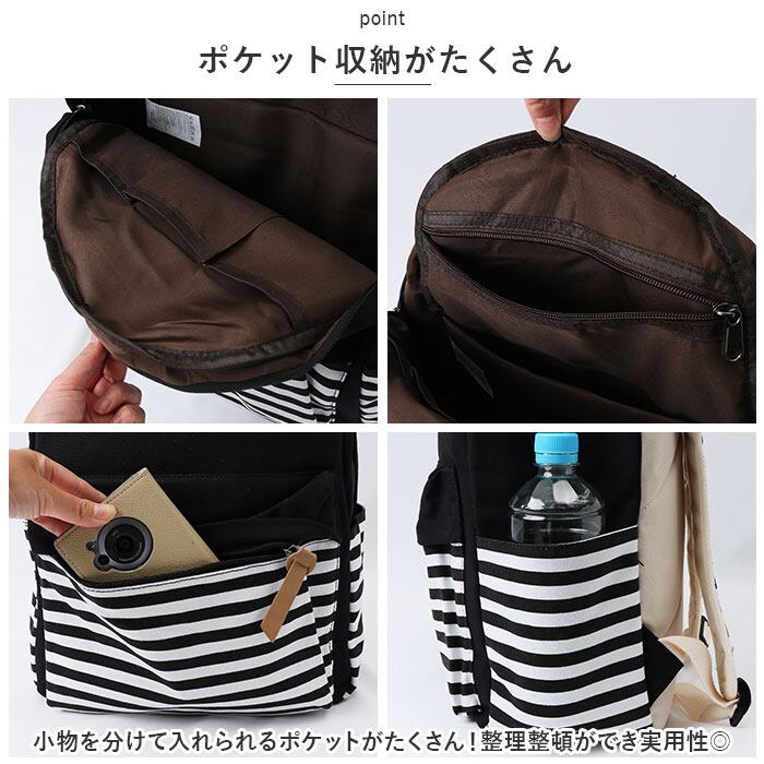 ・サイドやフロント、ショルダーのボーダーがかわいく、背負ってるだけで楽しい気分になれそう♪