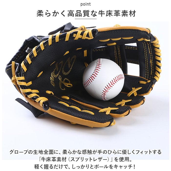 ・グローブの生地全面に、柔らかな感触が手のひらに優しくフィットする「牛床革素材(スプリットレザー)」を使用。軽く握るだけで、しっかりとボールをキャッチ!