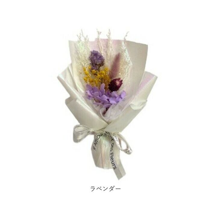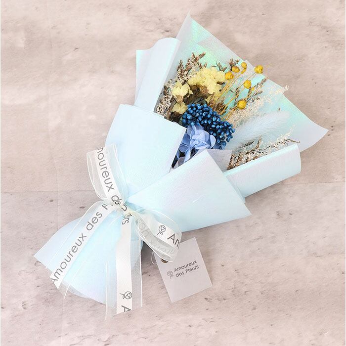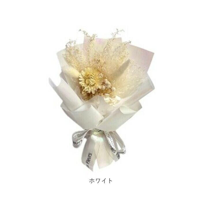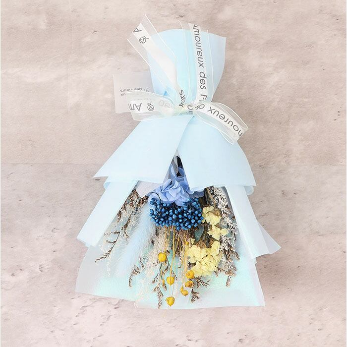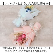・可愛らしいドライフラワーを光沢のあるペーパーで束ねた、ナチュラルで洗練された仕上がり。