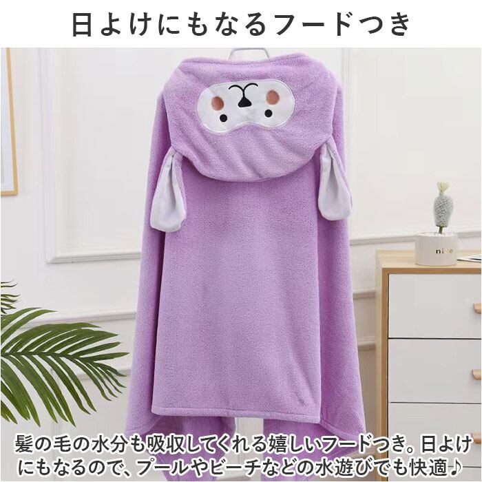 ・髪の毛の水分も吸収してくれる嬉しいフードつき。日よけにもなるので、プールやビーチなどの水遊びでも快適♪