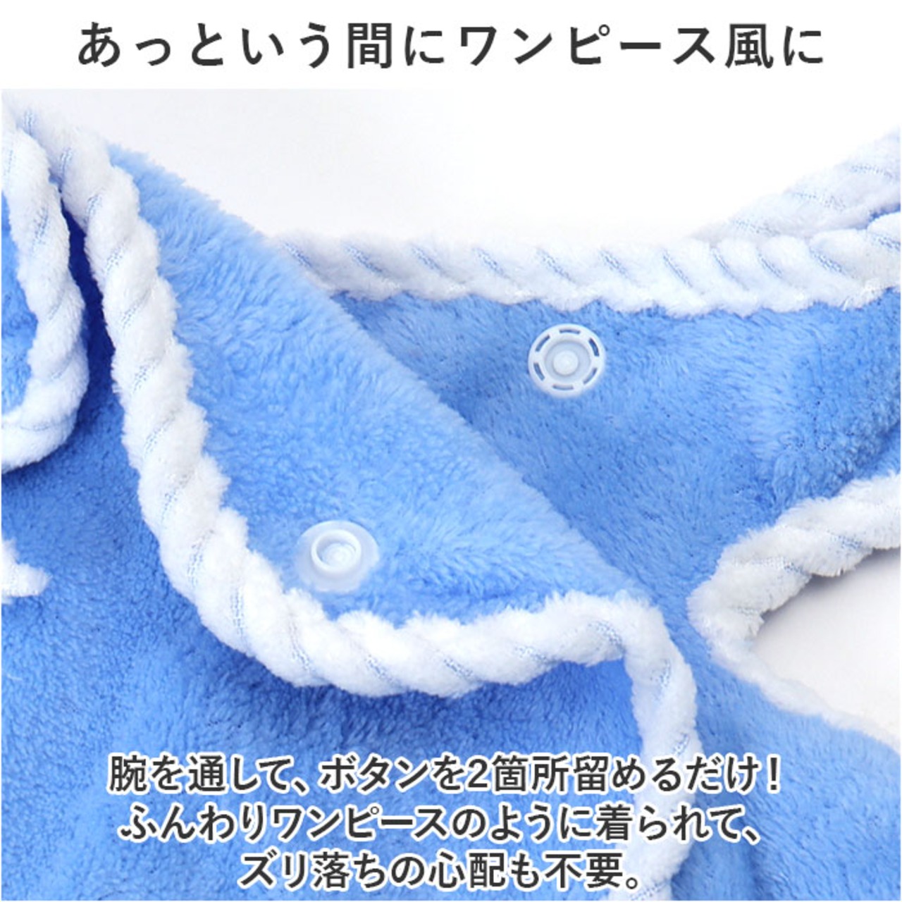 ・腕を通して、ボタンを2箇所留めるだけ!ふんわりワンピースのように着られて、ズリ落ちの心配も不要。