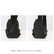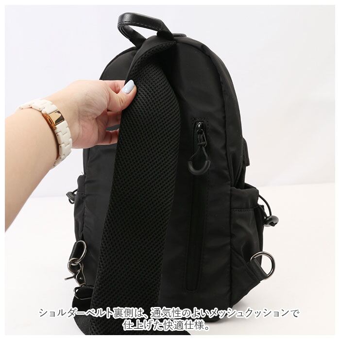 ・ショルダーベルト裏側は、通気性のよいメッシュクッションで仕上げた快適仕様。さらに、左右両方のフックで付け替えができるので、左掛け、右掛けどちらでもスタイリング自在。