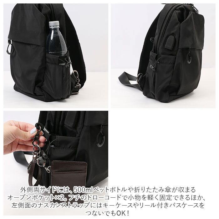 ・外側両サイドには、500mlペットボトルや折りたたみ傘が収まるオープンポケット×2。フチのドローコードで小物を軽く固定できるほか、左側面のナスカンストラップにはキーケースやリール付きパスケースをつないでもOK!