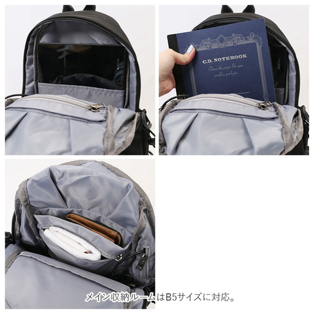・メインスペース内側に、小物の仕分けに便利なファスナーポケット×1に、オープンポケットも2ヶ所配置。背面側のクッション付きポケットには、iPad Miniのようなタブレットも収納可能。(※お手持ちのタブレット端末のサイズをご確認の上、お買い求めください。)