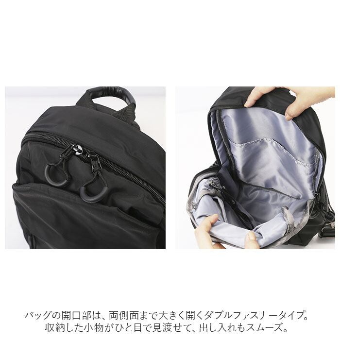 ・バッグの開口部は、両側面まで大きく開くダブルファスナータイプ。収納した小物がひと目で見渡せて、出し入れもスムーズ。
