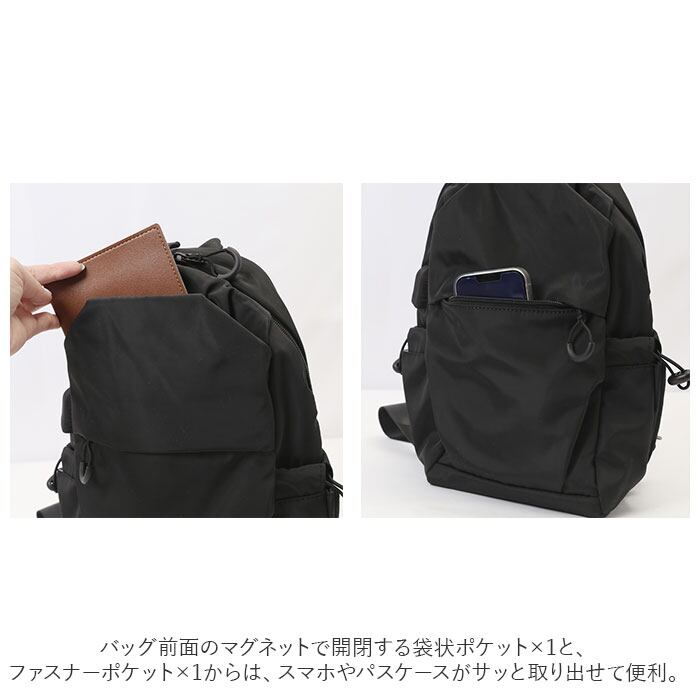 ・バッグ前面のマグネットで開閉する袋状ポケット×1と、ファスナーポケット×1からは、スマホやパスケースがサッと取り出せて便利。