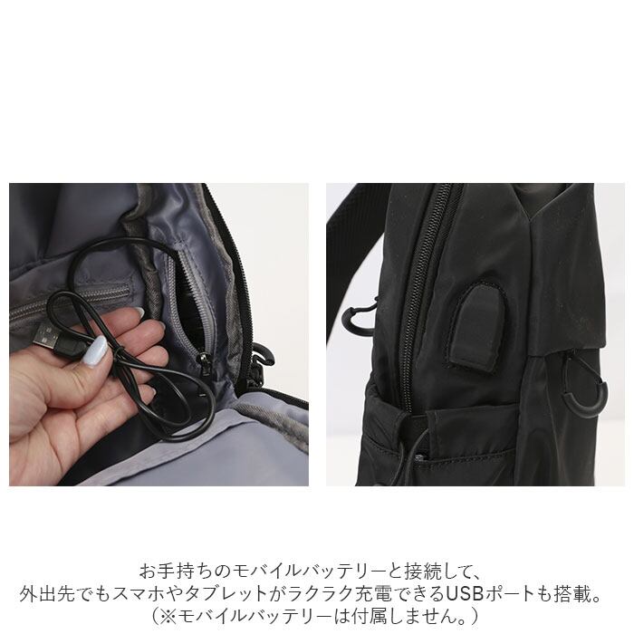 ・お手持ちのモバイルバッテリーと接続して、外出先でもスマホやタブレットがラクラク充電できるUSBポートも搭載。(※モバイルバッテリーは付属しません。)