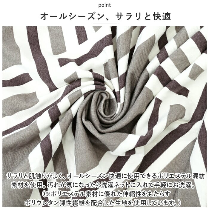 ・サラリと肌触りがよく、オールシーズン快適に使用できるポリエステル混紡素材を使用。汚れが気になったら洗濯ネットに入れて手軽にお洗濯ができるのも嬉しいポイント。(※ポリエステル素材に優れた伸縮性をもたらすポリウレタン弾性繊維を配合した生地を使用しています。)