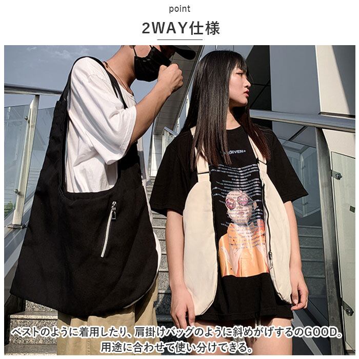 ・ベストのように着用したり、肩掛けバッグのように斜めがげするのもGOOD。用途に合わせて使い分けできる。