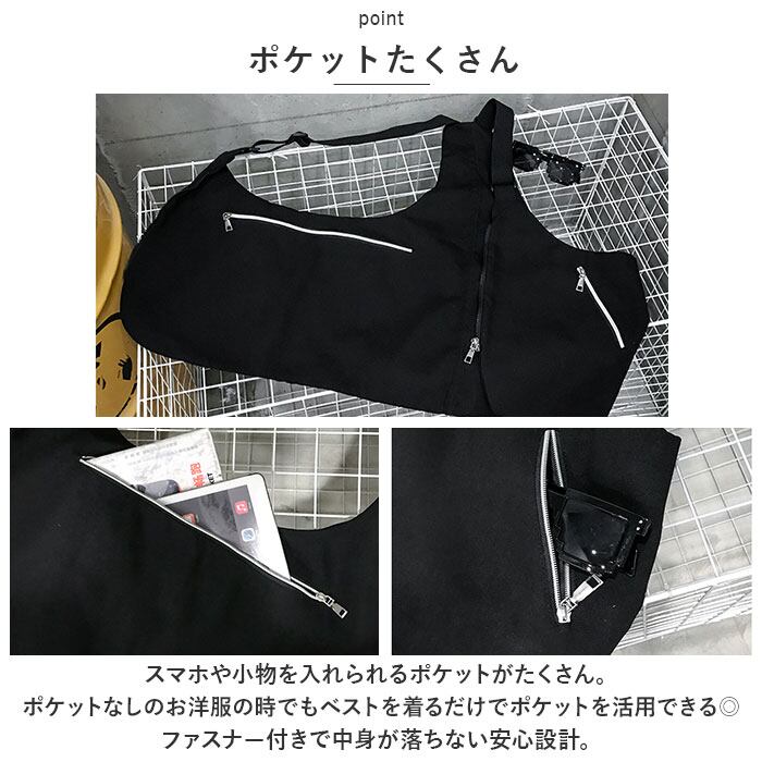 ・スマホや小物を入れられるポケットがたくさん。ポケットなしのお洋服の時でもベストを着るだけでポケットを活用できる◎ファスナー付きで中身が落ちない安心設計。