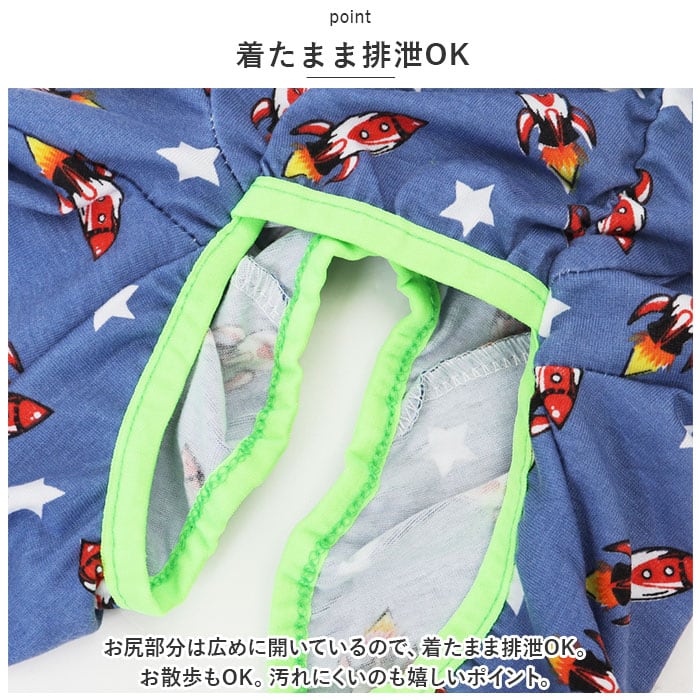 ・お尻部分は広めに開いているので、着たまま排泄OK。お散歩もOK。汚れにくいのも嬉しいポイント。