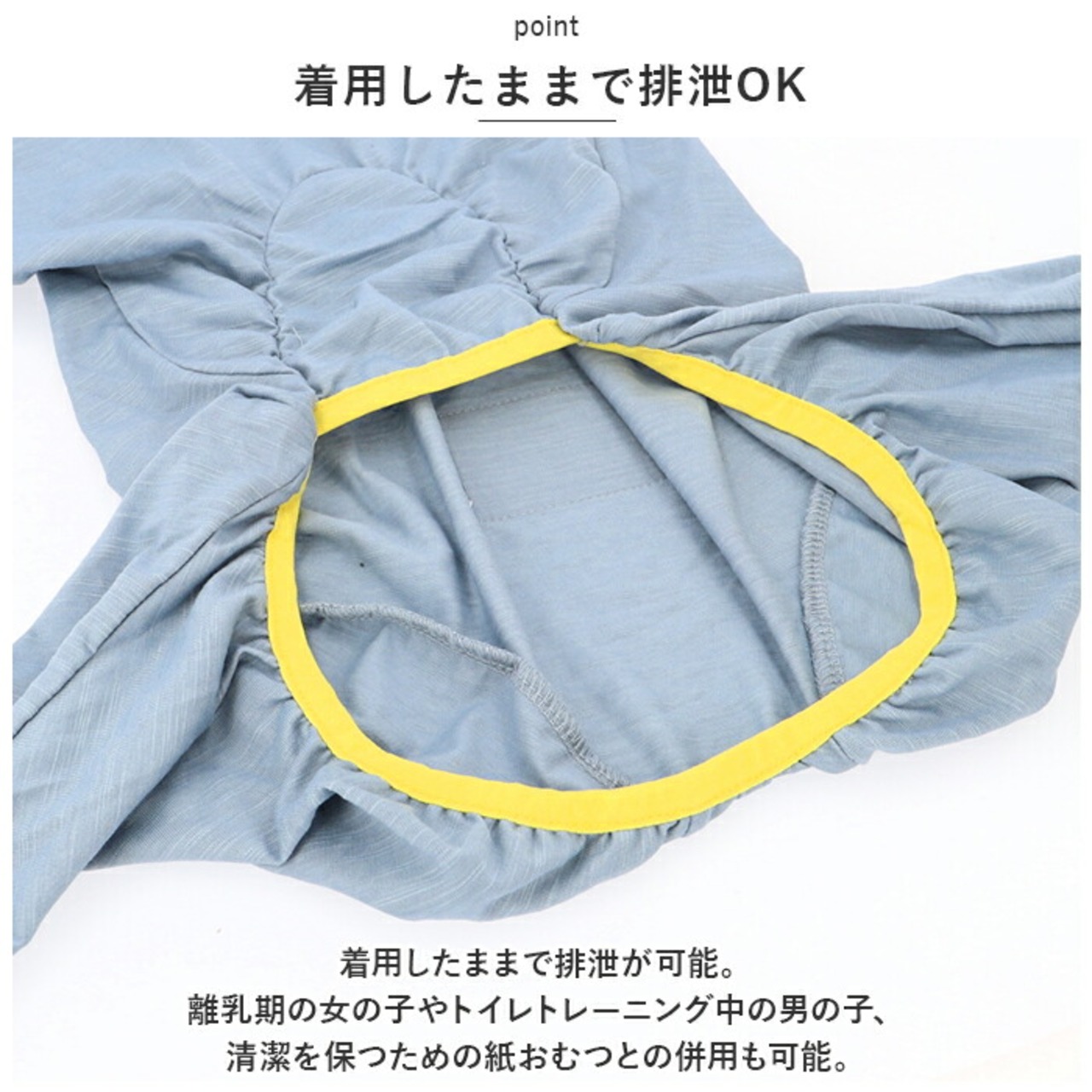・着用したままで排泄が可能。離乳期の女の子やトイレトレーニング中の男の子、清潔を保つための紙おむつとの併用も可能。