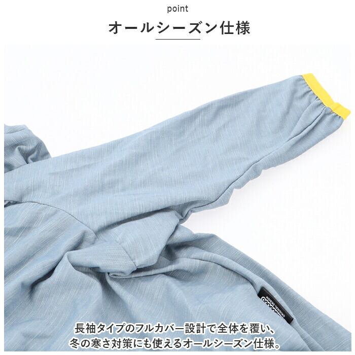 ・長袖タイプのフルカバー設計で全体を覆い、冬の寒さ対策にも使えるオールシーズン仕様。