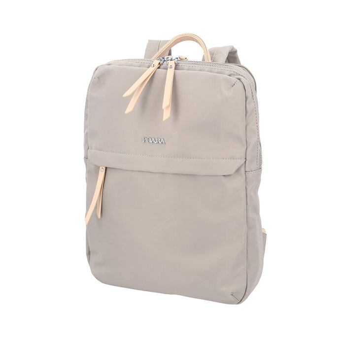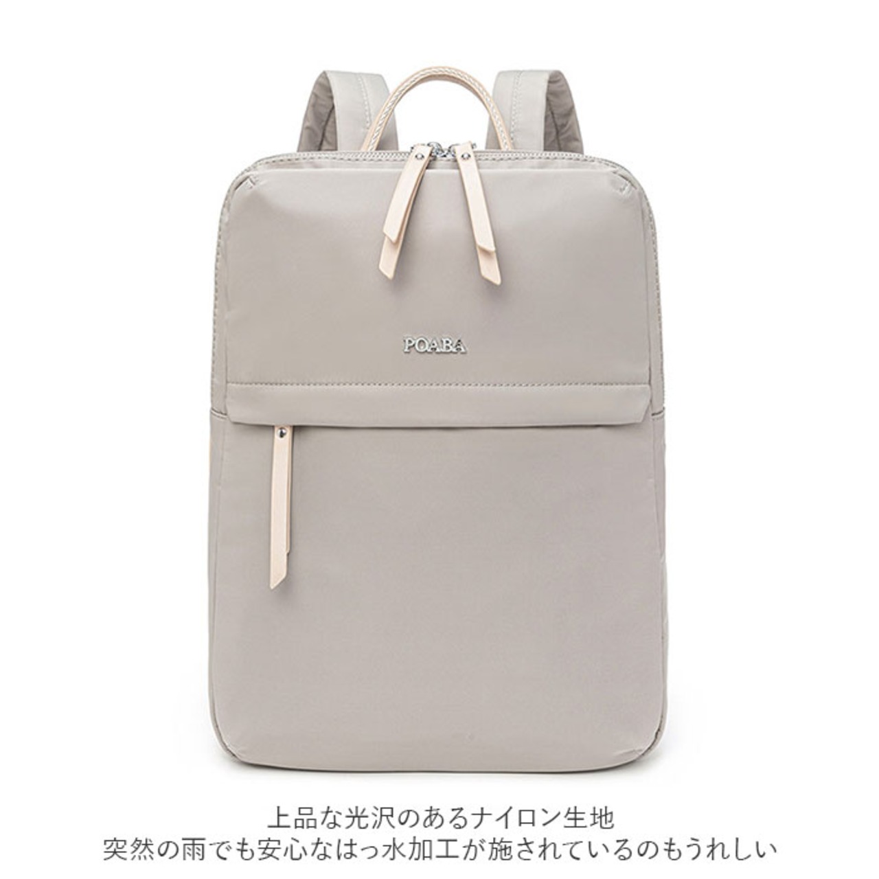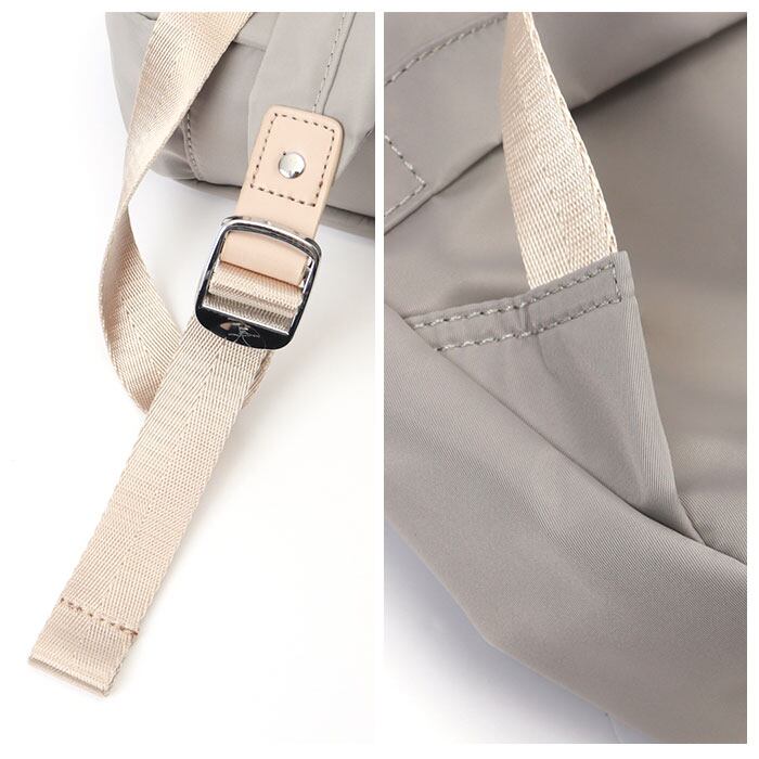 ・くすみ感のある生地に、フェイクレザーのファスナー引き手がアクセントになった大人カラー。突然の雨でも安心なはっ水加工が施されているのもうれしいポイント。