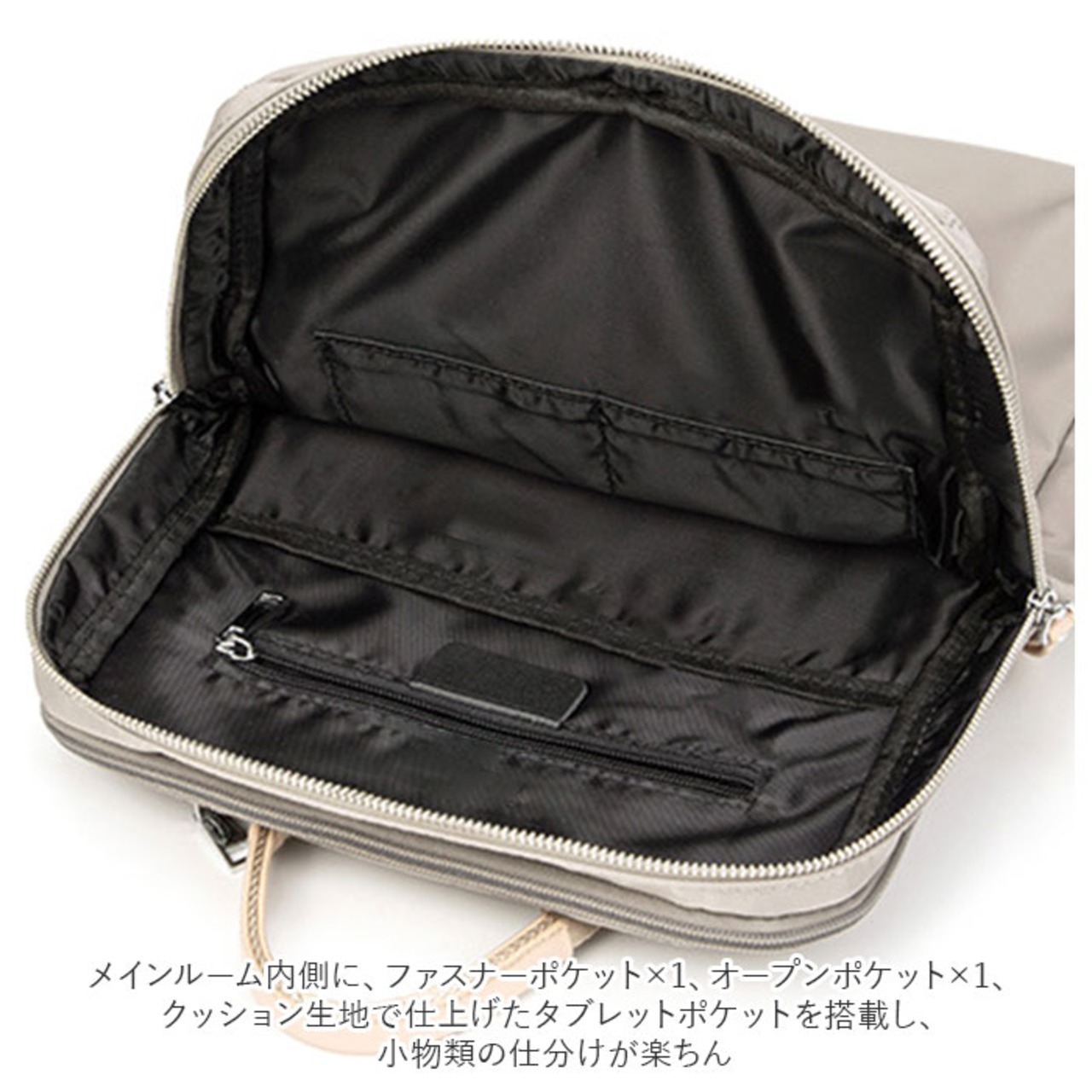 ・メインルーム内側に、ファスナーポケット×1、オープンポケット×1、クッション生地で仕上げたタブレットポケットを搭載し、小物類の仕分けが楽ちん。