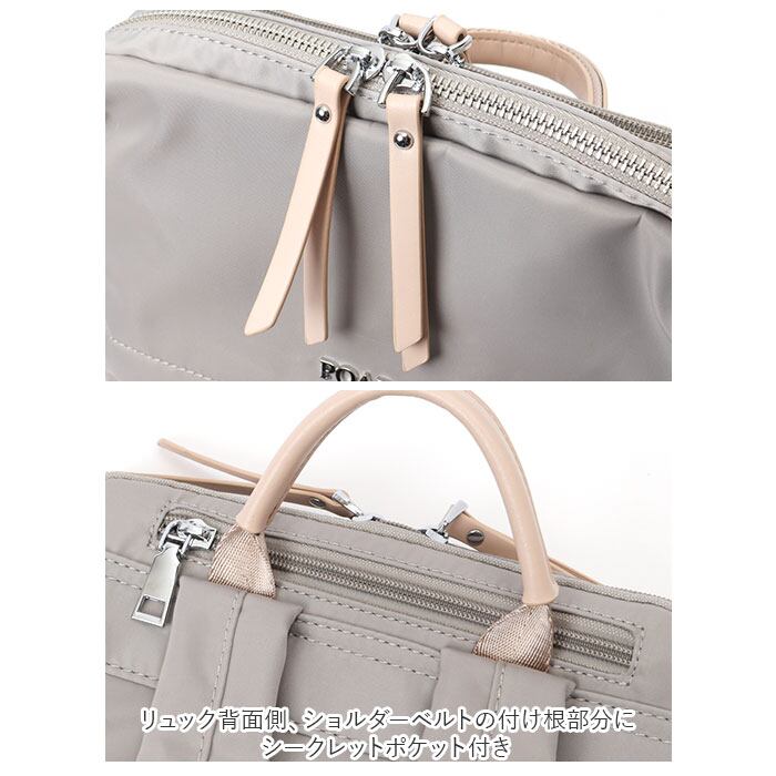 ・リュック背面側、ショルダーベルトの付け根部分に、パスポートやコインケースなど貴重品の収納に便利なシークレットポケット付き。