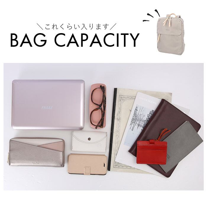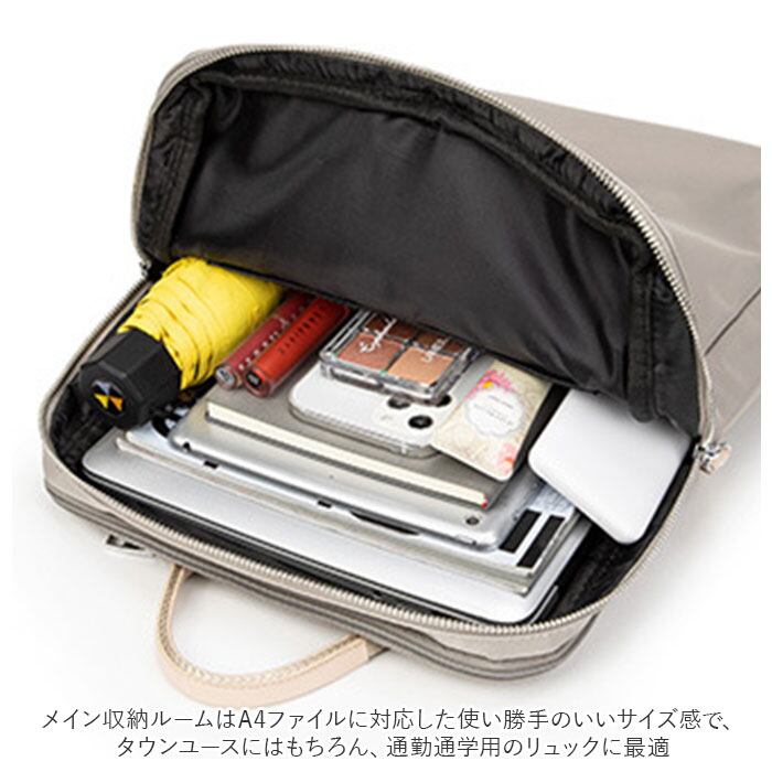 ・メイン収納ルームはA4ファイルに対応した使い勝手のいいサイズ感で、タウンユースにはもちろん、通勤通学用のリュックに最適。