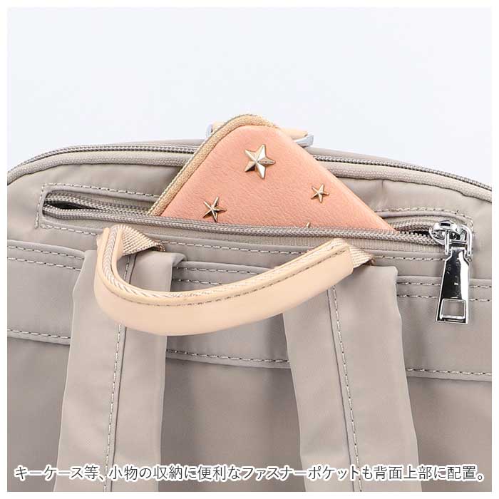 ・さらにキーケース等、小物の収納に便利なファスナーポケットも背面上部に配置。