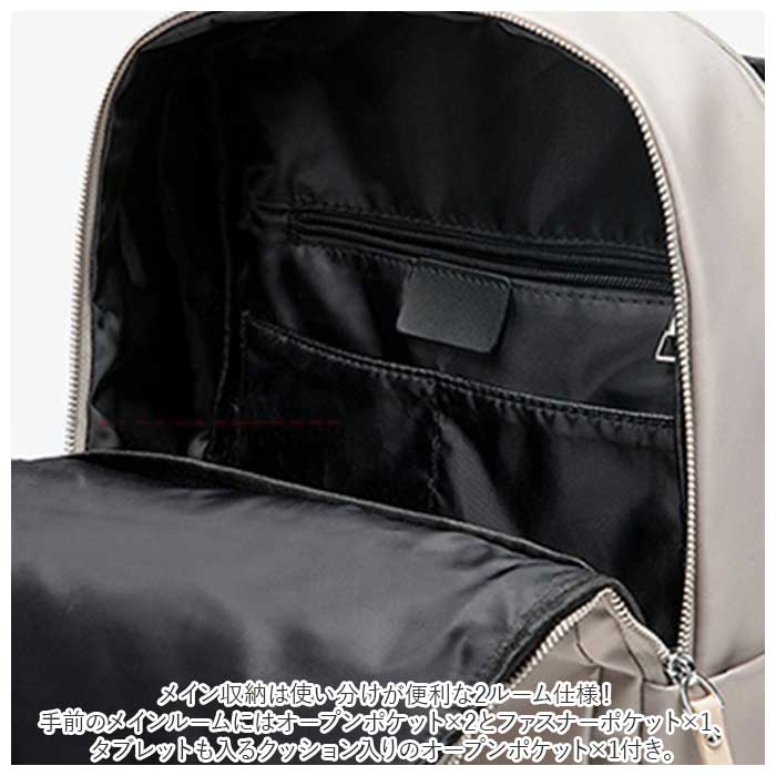 ・メイン収納は使い分けが便利な2ルーム仕様!手前のメインルームにはオープンポケット×2とファスナーポケット×1、タブレットも入るクッション入りのオープンポケット×1付き。