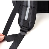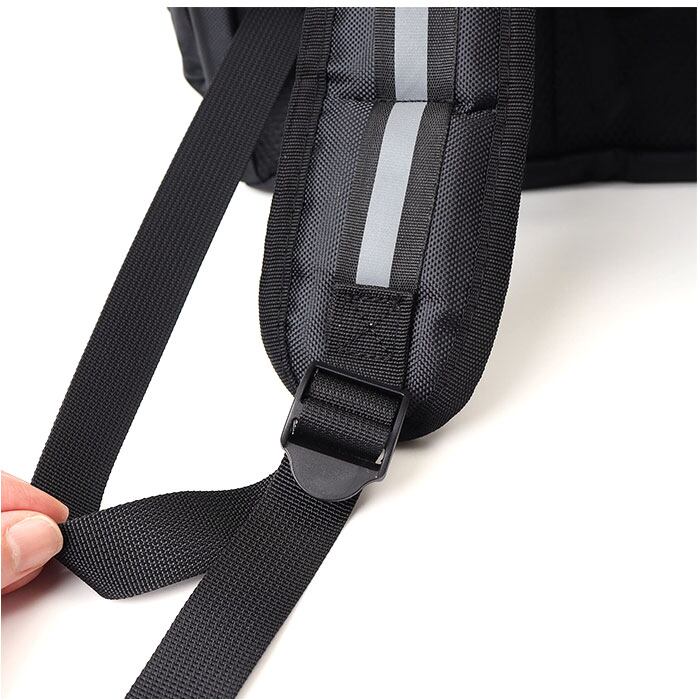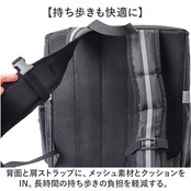 ・背面と肩ストラップに、メッシュ素材とクッションをIN。長時間の持ち歩きの負担を軽減する。