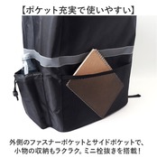 ・外側のファスナーポケットとサイドポケットで、小物の収納もラクラク。ミニ栓抜きを搭載!