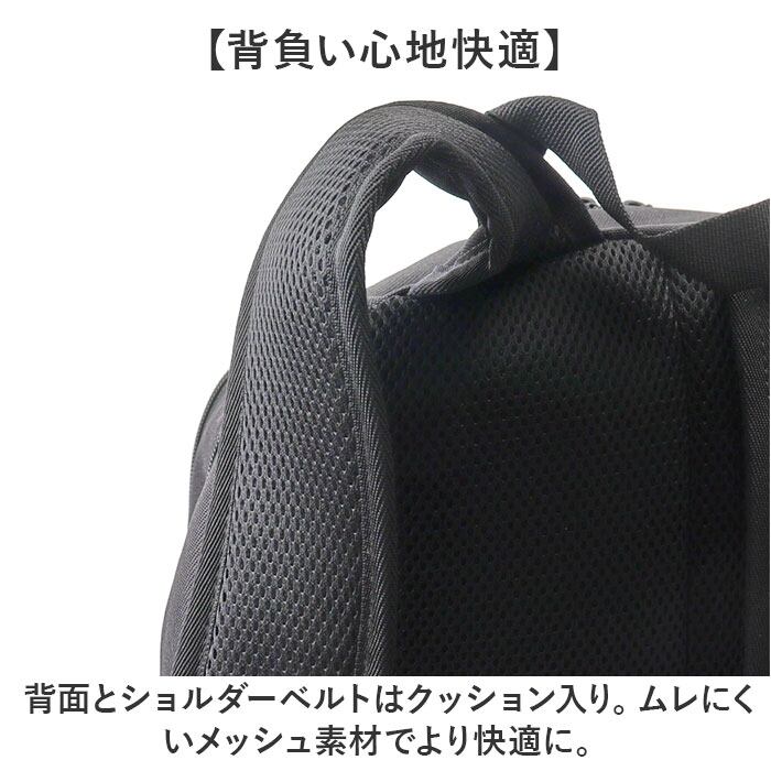 ・背面とショルダーベルトはクッション入り。ムレにくいメッシュ素材でより快適に。