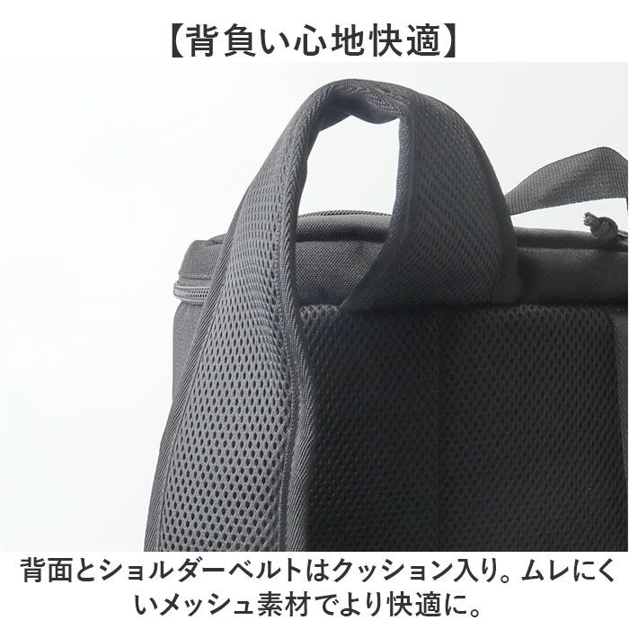・背面とショルダーベルトはクッション入り。ムレにくいメッシュ素材でより快適に。