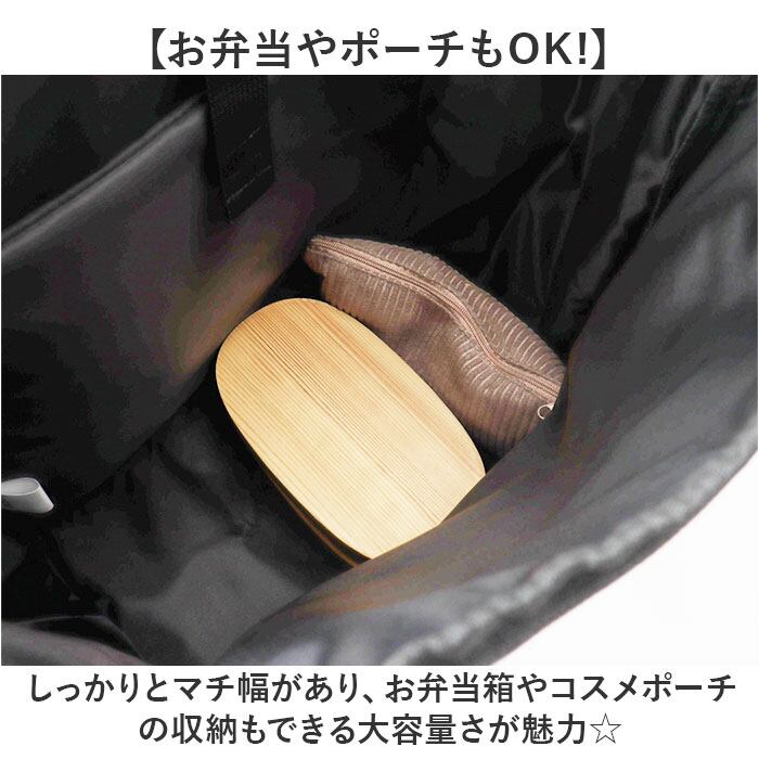 ・しっかりとマチ幅があり、お弁当箱やコスメポーチの収納もできる大容量さが魅力☆