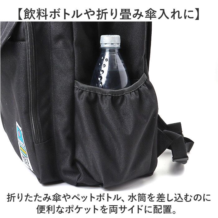 ・折りたたみ傘やペットボトル、水筒を差し込むのに便利なポケットを両サイドに配置。