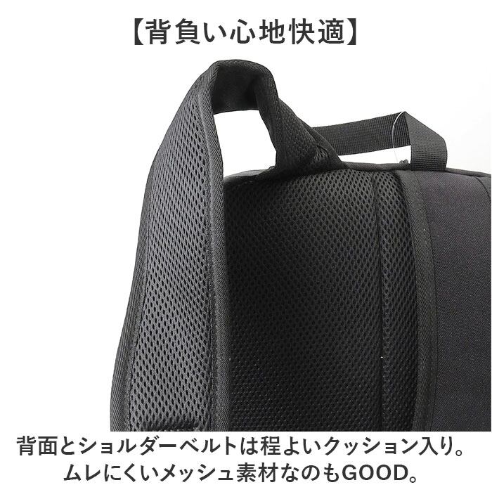 ・背面とショルダーベルトは程よいクッション入り。ムレにくいメッシュ素材なのもGOOD。