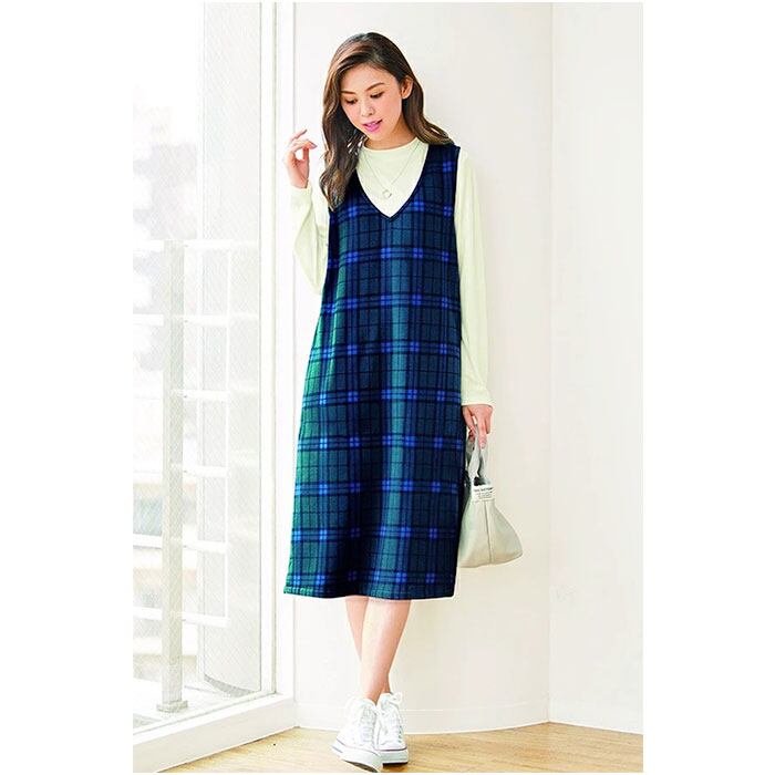 ・ジャンパースカートはチェック柄と無地の組み合わせ。
