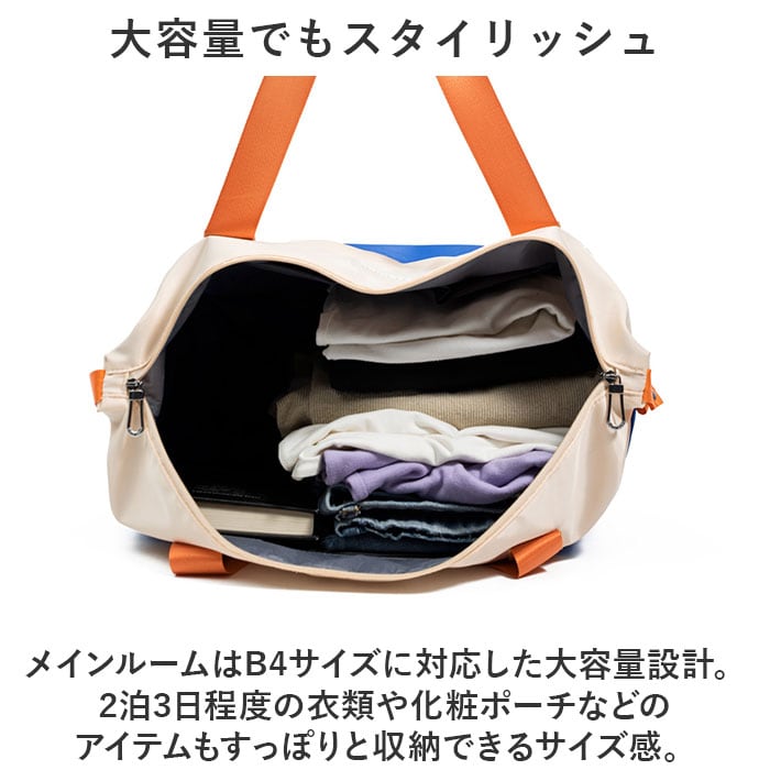 ・メインルームはB4サイズに対応した大容量設計。2泊3日程度の衣類や化粧ポーチなどのアイテムもすっぽりと収納できるサイズ感。