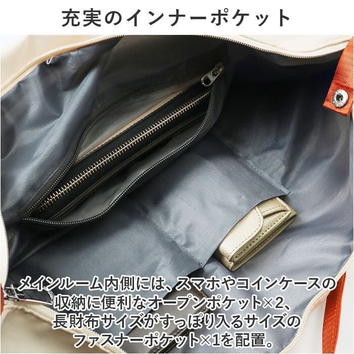 ・メインルーム内側には、スマホやコインケースの収納に便利なオープンポケット×2、長財布サイズがすっぽり入るサイズのファスナーポケット×1を配置。