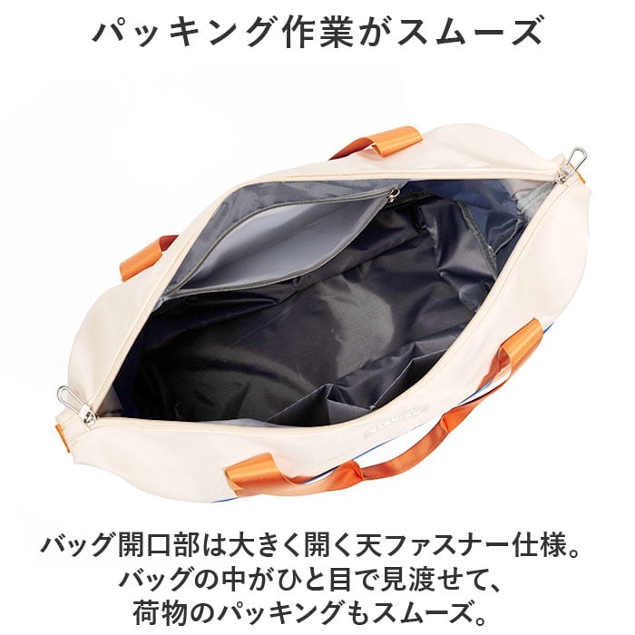 ・バッグ開口部は大きく開く天ファスナー仕様。バッグの中がひと目で見渡せて、荷物のパッキングもスムーズ。