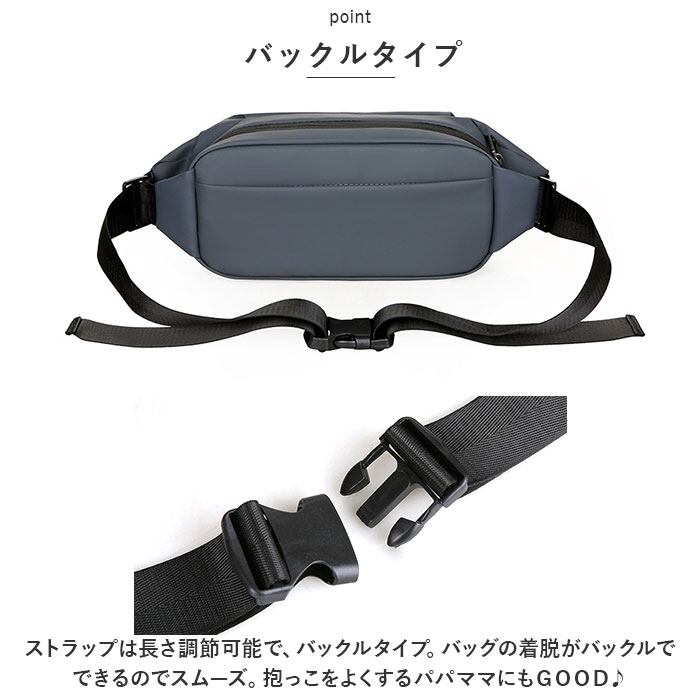 ・ストラップは長さ調節可能で、バックルタイプ。バッグの着脱がバックルでできるのでスムーズ。抱っこをよくするパパママにもGOOD♪