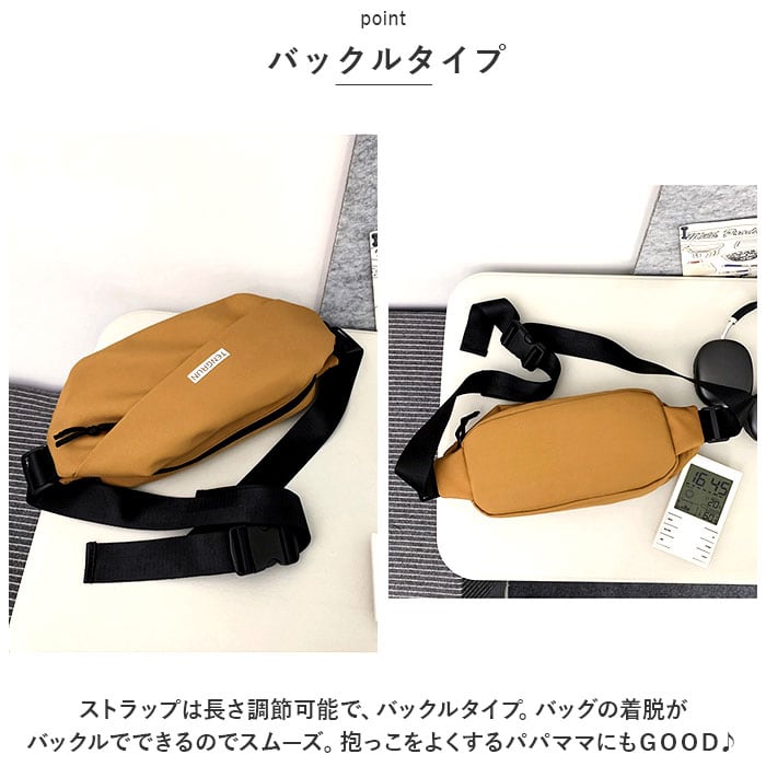 ・ストラップは長さ調節可能で、バックルタイプ。バッグの着脱がバックルでできるのでスムーズ。抱っこをよくするパパママにもGOOD♪