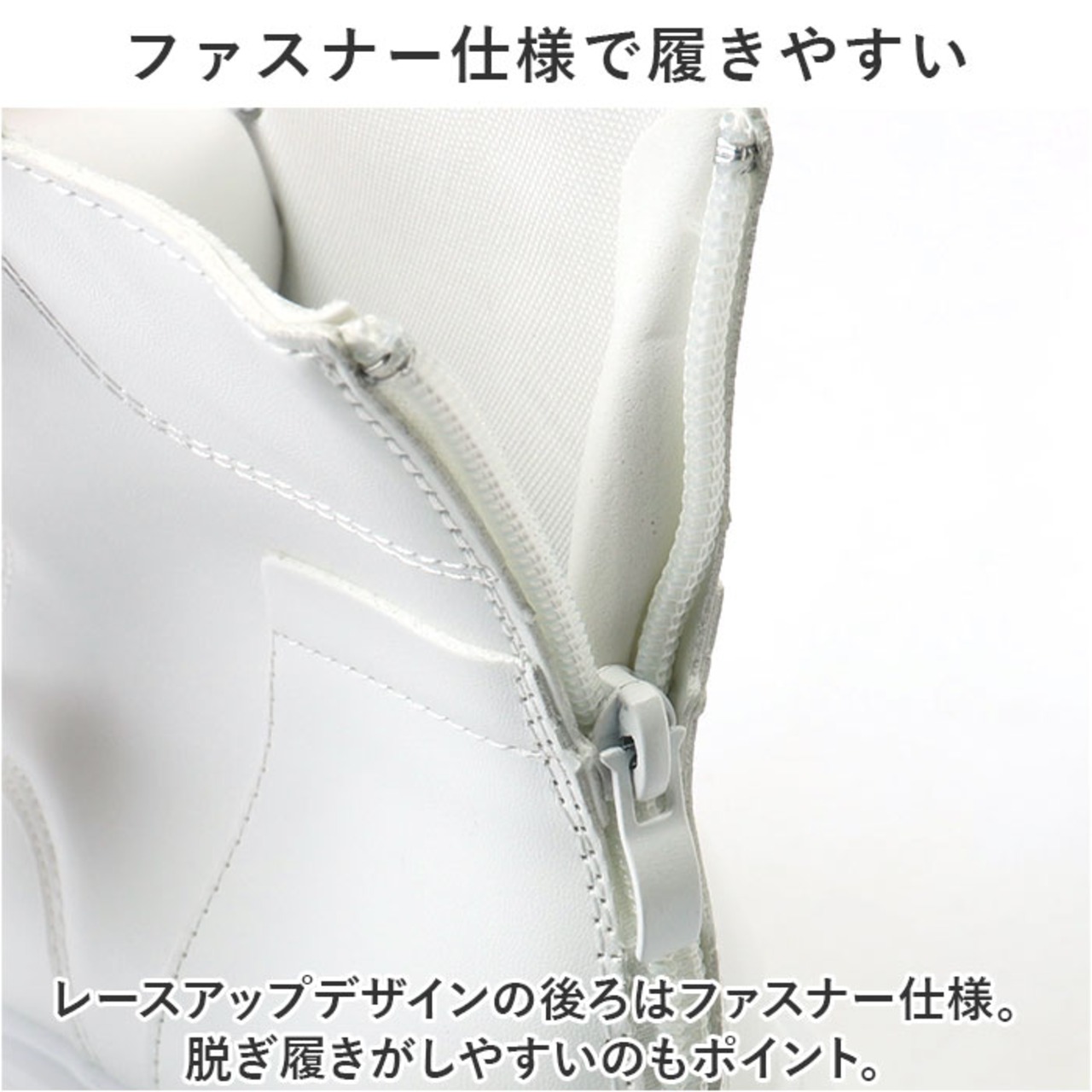 ・レースアップデザインの後ろはファスナー仕様。脱ぎ履きがしやすいのもポイント。