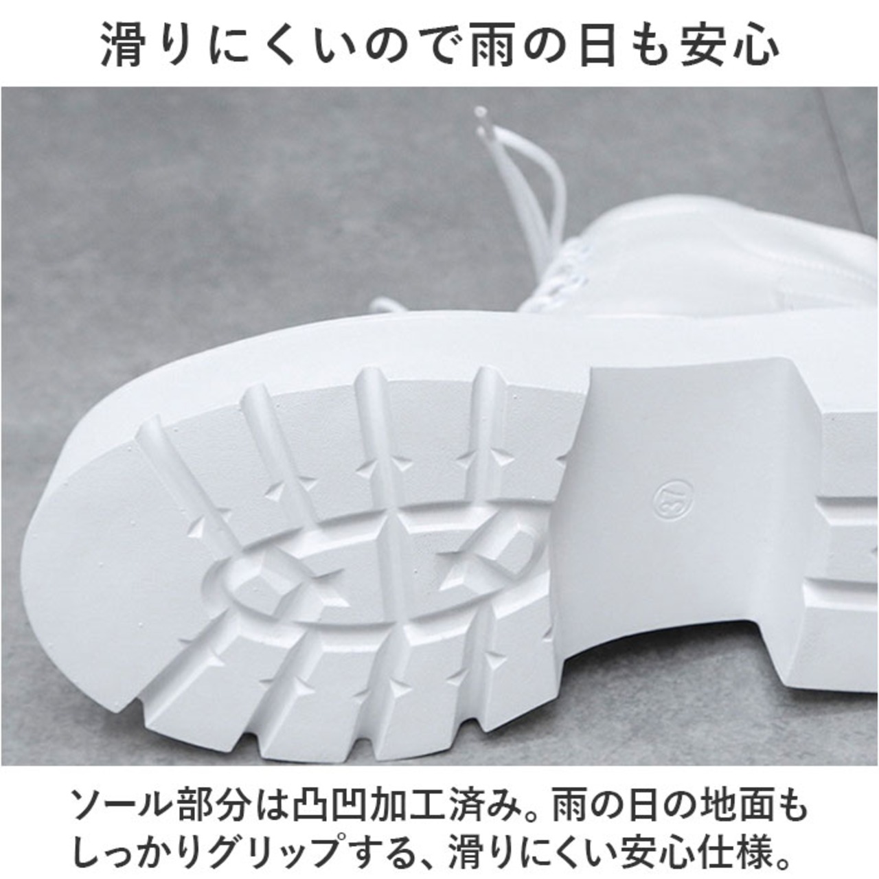 ・ソール部分は凸凹加工済み。雨の日の地面もしっかりグリップする、滑りにくい安心仕様。