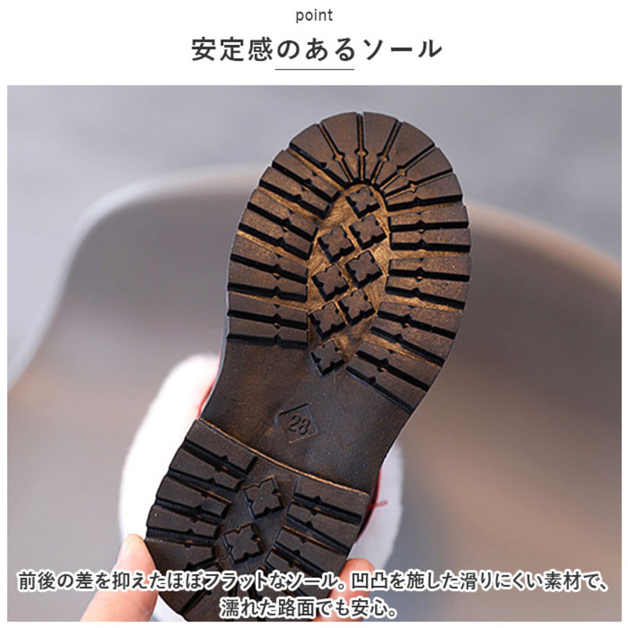 ・前後の差を抑えたほぼフラットなソール。凹凸を施した滑りにくい素材で、濡れた路面でも安心。