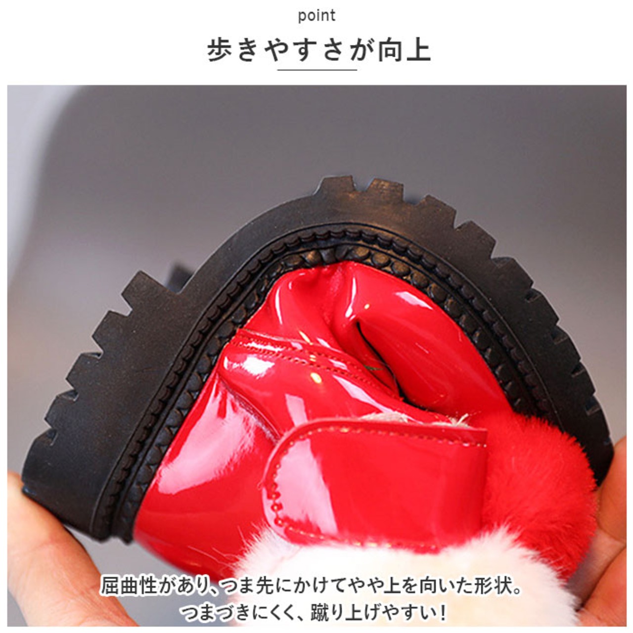 ・屈曲性があり、つま先にかけてやや上を向いた形状。つまづきにくく、蹴り上げやすい!