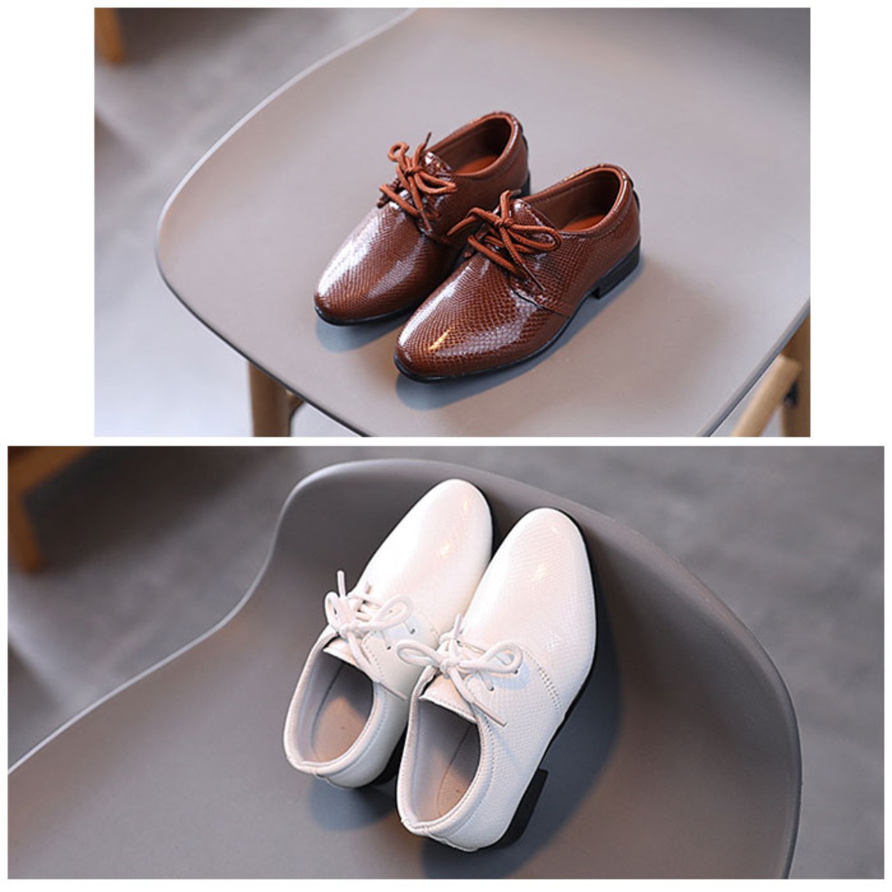 ・PUレザーを使用したきっちり感のあるシューズ。大人の革靴のような見た目で、コーデを仕上げてくれるアイテム。