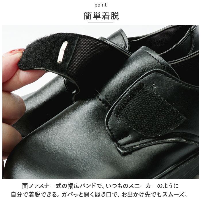 ・面ファスナー式の幅広バンドで、いつものスニーカーのように自分で着脱できる。ガバっと開く履き口で、お出かけ先でもスムーズ。