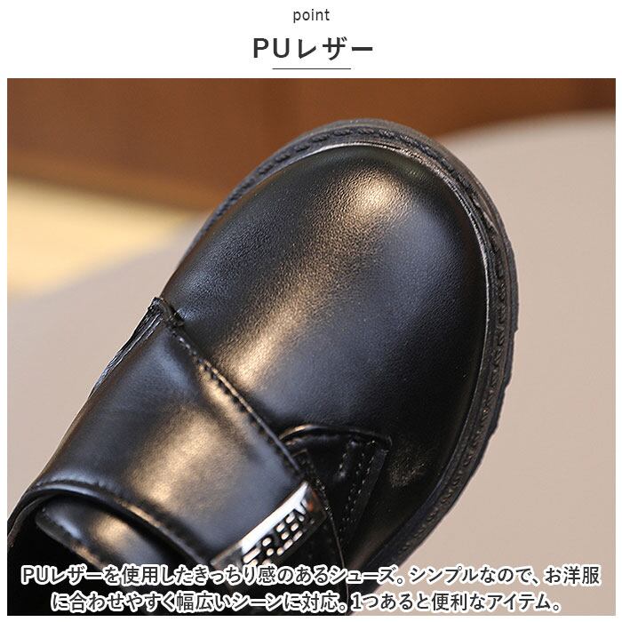 ・PUレザーを使用したきっちり感のあるシューズ。シンプルなので、お洋服に合わせやすく幅広いシーンに対応。1つあると便利なアイテム。