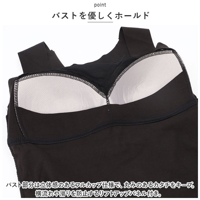 ・バスト部分は立体感のあるフルカップ仕様で、丸みのあるカタチをキープ。横流れや滑りを防止するリフトアップパネル付き。