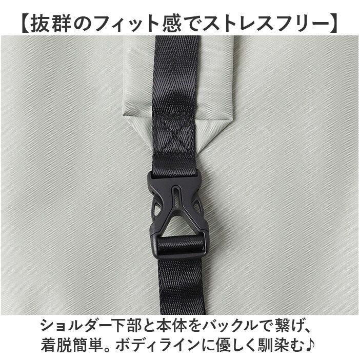・ショルダー下部と本体をバックルで繋げ、着脱簡単。ボディラインに優しく馴染む♪