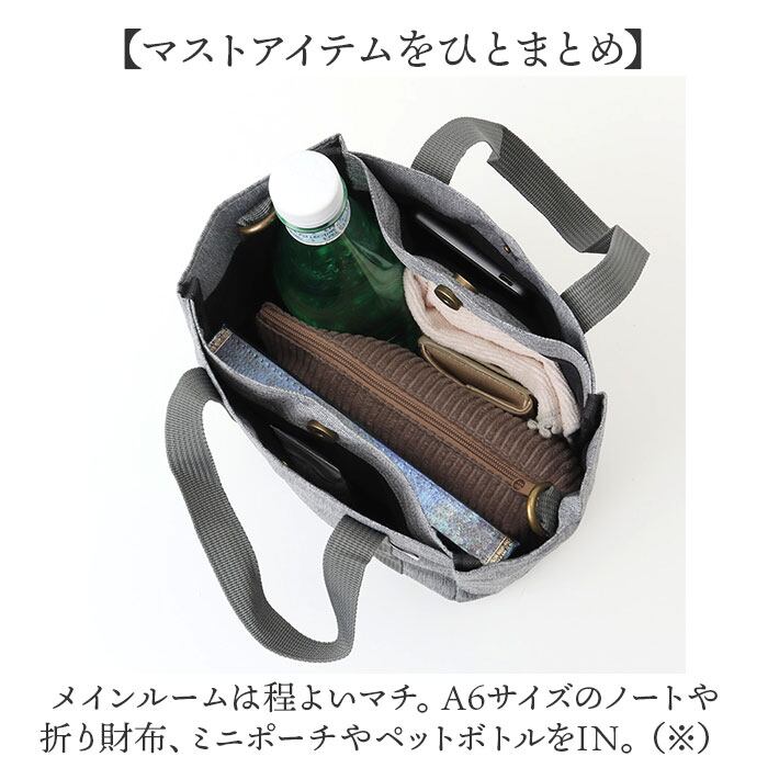 ・メインルームは程よいマチ。A6サイズのノートや折り財布、ミニポーチやペットボトルをIN。