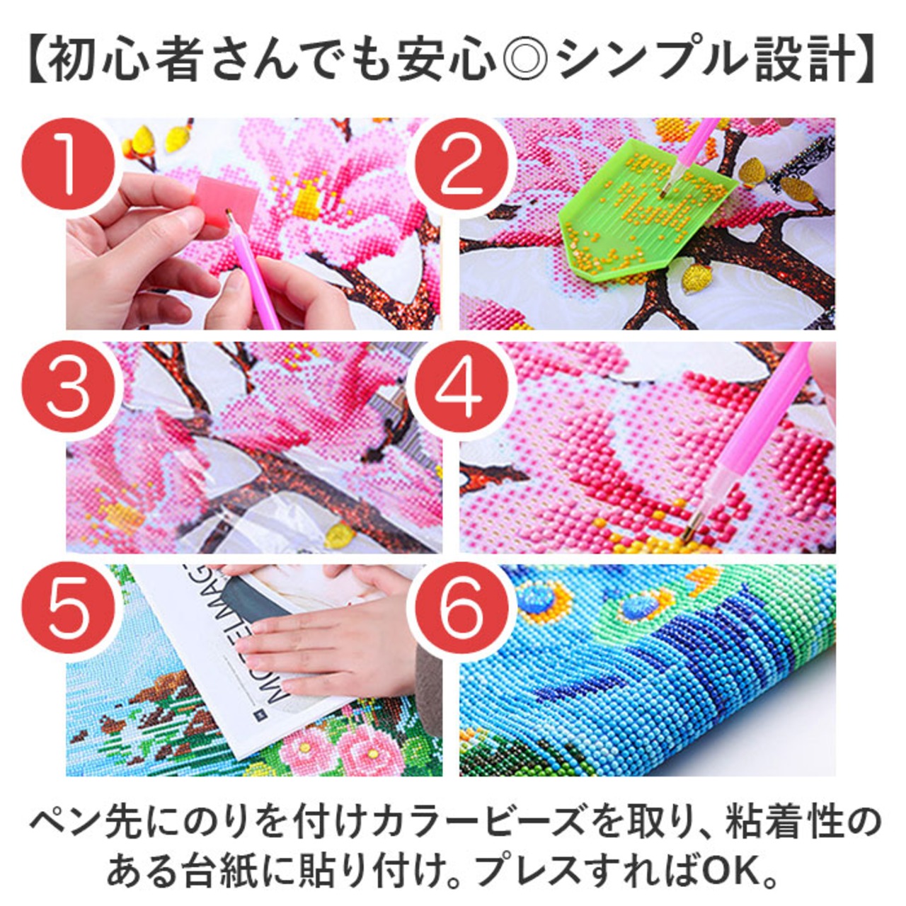 ・ペン先にのりを付けカラービーズを取り、粘着性のある台紙に貼り付け。プレスすればOK。