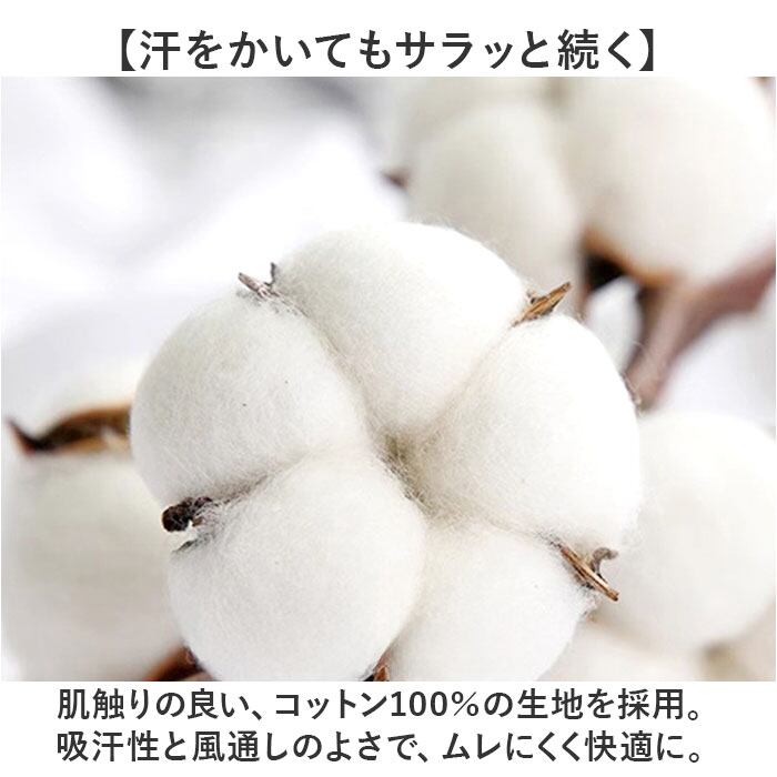 ・肌触りの良い、コットン100%の生地を採用。吸汗性と風通しのよさで、ムレにくく快適に。
