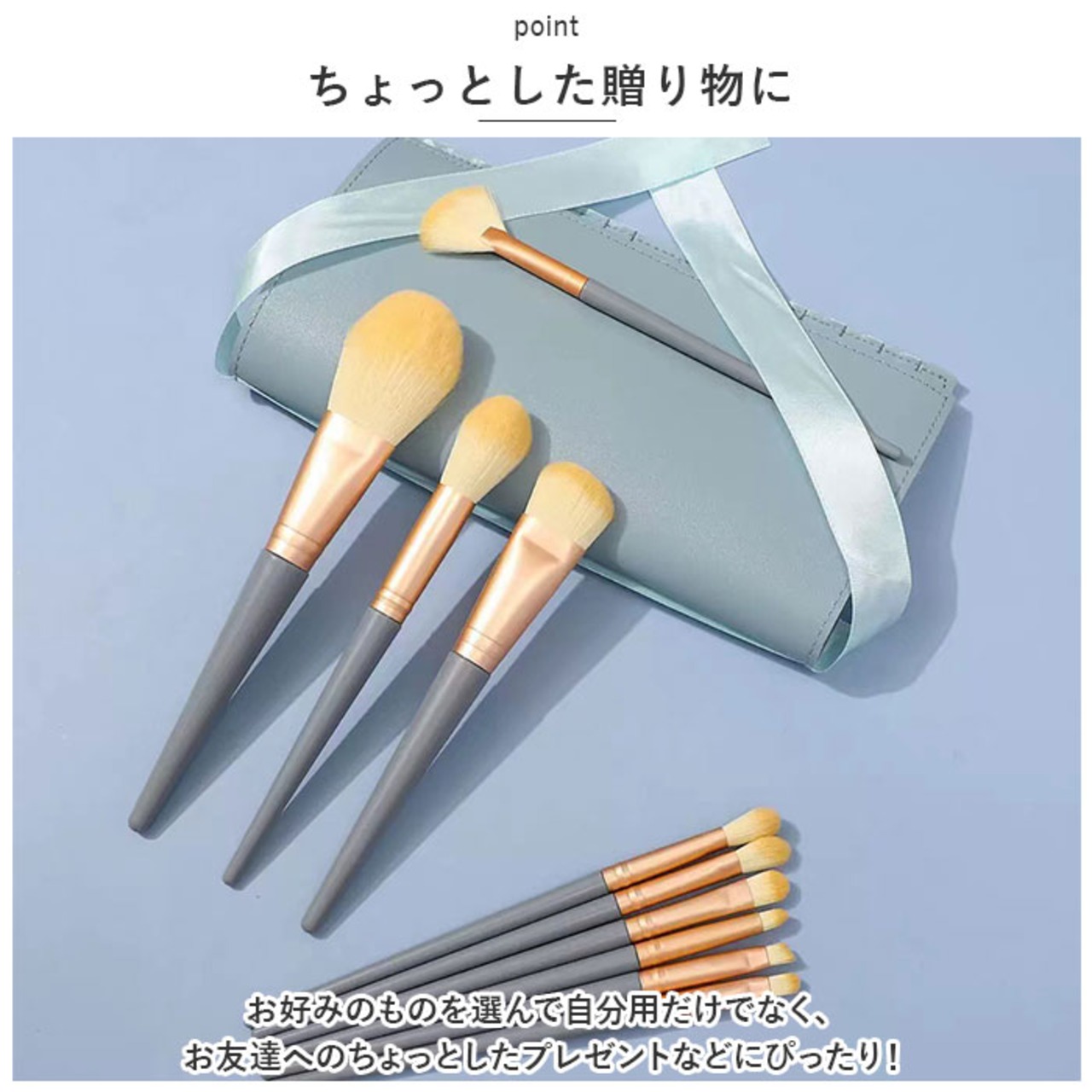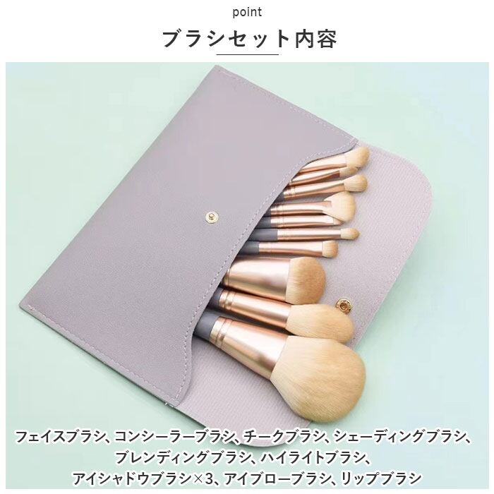 ・フェイスブラシ、コンシーラーブラシ、チークブラシ、シェーディングブラシ、ブレンディングブラシ、ハイライトブラシ、アイシャドウブラシ×3、アイブローブラシ、リップブラシ
