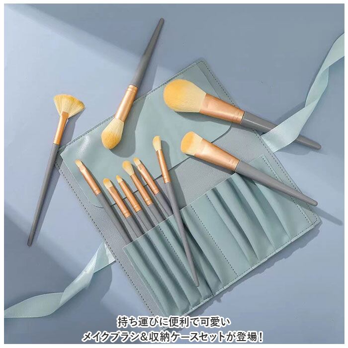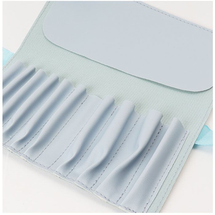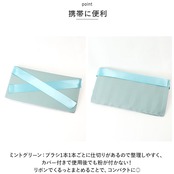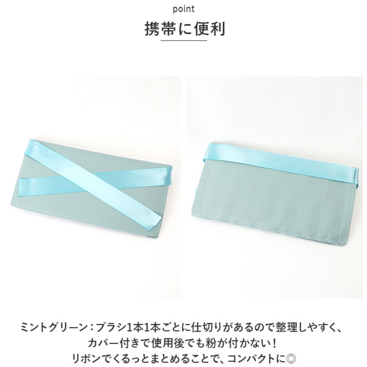 ・ミントグリーン:ブラシ1本1本ごとに仕切りがあるので整理しやすく、カバー付きで使用後でも粉が付かない!リボンでくるっとまとめることで、コンパクトに◎